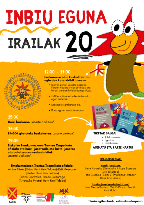 La fiesta Inbiu de Igorre regresa el próximo sábado 20 de septiembre con un nuevo reto colectivo: formar la espiral humana más larga realizada en Euskal Herria a favor del euskera. El programa arrancará a las 12:00 horas en el parque Lasarte, donde comenzará la cadena humana. Desde allí, el recorrido atravesará Igorre y terminará en el campo de fútbol de Urbieta, donde a las 13:00 horas se formará la gran espiral. El acto contará con gradas para el público y quedará registrado con un vídeo aéreo grabado con dron, que dará testimonio de la fuerza social a favor del euskera.