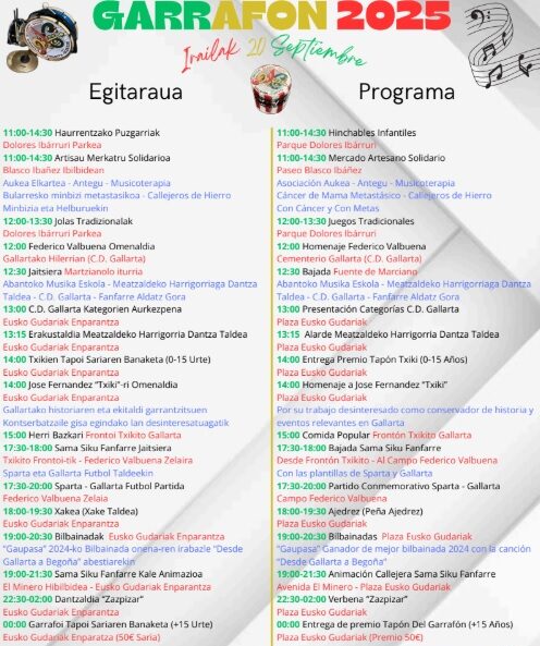 A las 14:00h se realizará la Entrega de Premio Tapón Txiki (-15 años) en la Plaza Eusko Gudariak, junto con un homenaje a José Fernández, “Txiki”, por su trabajo desinteresado como conservador de historia y eventos relevantes en Gallarta. A las 15:00h se celebrará una Comida Popular en el Frontón Txikito Gallarta y a las 17:30h Bajada a cargo de Sama Siku Fanfarre desde el Frontón Txikito hasta el campo Federico Valbuena, con las plantillas de Sparta y Gallarta y posterior partido conmemorativo entre ambos equipos. A las 18:00h partida de Ajedrez a cargo de la Peña Ajedrez, en la Plaza Eusko Gudariak y a las 19:00h Bilbainadas con el grupo “Gaupasa”, ganador de la mejor bilbainada 2024 con la canción “Desde Gallarta a Begoña”.