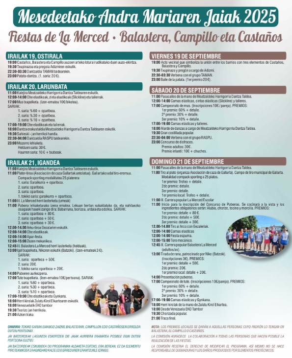 Las fiestas comenzarán el viernes a las 19:00h con un Acto vecinal que simboliza la unión entre los barrios con tres elementos de Castaños, Balastera y Campillo, seguido del txupinazo y lectura del pregón a cargo de Adizmi. A las 22:30 se celebrará una verbena con el grupo Taman y las actividades festivas se cerrarán a las 23:00 con el Baile de la patata.