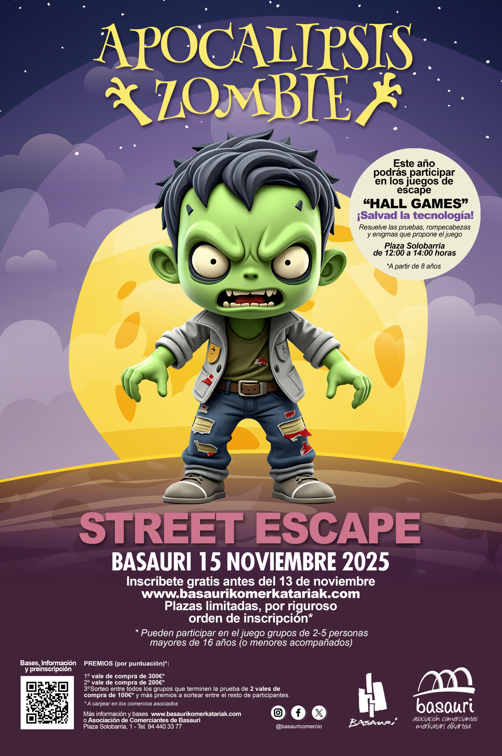 La Asociación de Comerciantes organiza el próximo sábado 15 de noviembre, por la mañana, el STREET ESCAPE “APOCALIPSIS ZOOMBIE”. Este juego de escape tiene el objetivo de dar a conocer los comercios, hostelería y servicios locales de las diferentes zonas de Basauri, dar visibilidad y acercar a los jóvenes al comercio local.
