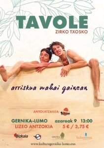Tavole es nuestra visión de la vida actual, ampliada y exagerada por las lentes del circo y del humor. Relatos y experiencias cotidianas que se entrelazan con la fantasía. TAVOLE te lleva a un mundo lleno de humor y reflexión; inspirado en problemas de la sociedad actual, y a través del lenguaje universal del circo estos dos personajes llegarán a la conclusión de que la única solución a estos problemas es la convivencia, la comunicación y el respeto. Toda la información y las entradas en kulturagernika-lumo.eus.