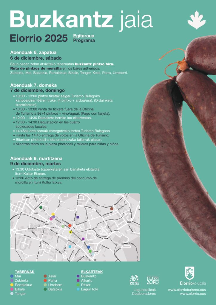 La programación arrancará el 6 de diciembre con la clásica ruta de pintxos de morcilla, una receta profundamente ligada a la identidad local. Durante toda la jornada, los bares Zubiertz, Mai, Batzokia, Portalekua, Bikale, Tanger, Xelai, Parra y Urreberri ofrecerán sus elaboraciones especiales, generando un recorrido gastronómico por el corazón del pueblo y reforzando la tradición culinaria de Elorrio.