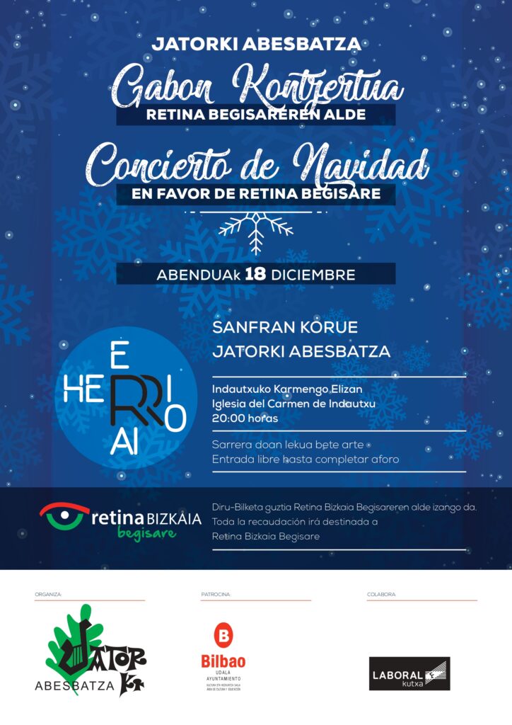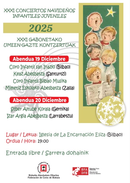 Conciertos organizados por la Federación de Coros de Bizkaia que se celebrarán en la Iglesia de La Encarnación de Bilbao (Atxuri) los días 19 y 20 de diciembre de 2025, a las 19:00 horas, donde participarán alrededor de 200 coralistas miembros de los siguientes coros: Zuzendariak / Directoras: Ana Nieva e Itziar Ruiz Zuzendaria / Director: Xabier Monge Zuzendaria / Directora: Diana Caracciolo Zuzendaria / Directora: Maite Olmos Zuzendaria / Directora: Aintzane Garamendi Zuzendaria / Directora: Marta Omagogeascoa