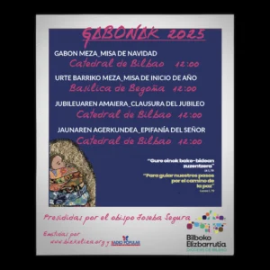 Se retransmitirán las Misas de Navidad (25 de diciembre, 12:00 h., desde la catedral), Año Nuevo (1 de enero, 12:00 h., desde la Basílica de Begoña) y Epifanía (6 de enero, 12:00 h., desde la catedral).