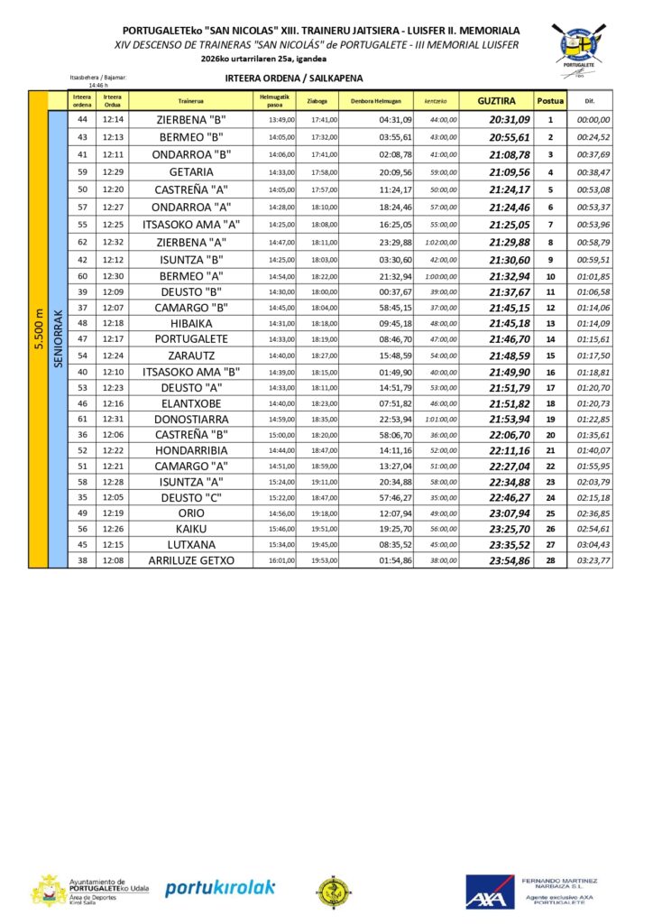 En categoría masculina, y con 28 embarcaciones (18 de ellas vizcaínas), fue la segunda de Zierbena la que se llevaría el descenso con 24″ sobre Bermeo B y 37 de ventaja con Ondarroa B. La siguiente en la lista fue Getaria, con su primera trainera, con Castro detrás. La sexta plaza fue para el primer bote ondarrutarra, seguido por Santurtzi y Zierbena A. La segunda embarcación de Isuntza y la primera de Bermeo completaron el «top 10». En el caso de Orio, acabaron en la 25ª plaza, a algo más de dos minutos y medio de la cabeza.
