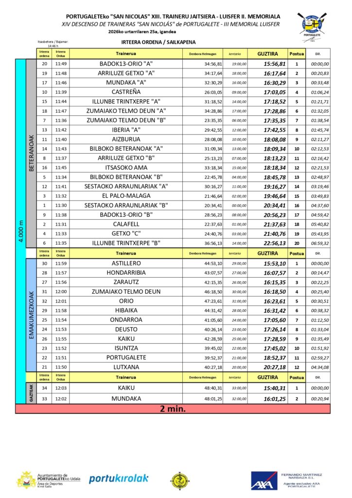 Asistíamos ayer a la primera cita arraunlari de la pretemporada con el XIV Descenso de Portugalete-III Memorial Luisfer y la presencia de un total de 62 botes en las diferentes categorías. Y lo cierto es que pocas conclusiones podemos sacar de lo visto en aguas portugalujas, ya que la meteorología y la marea fueron las principales protagonistas de la mañana. De esta forma, las traineras más madrugadoras acabarían siendo las grandes beneficiadas de la cita. Así, las tres primeras plazas en la clasificación final las ocuparon otros tantos botes B.