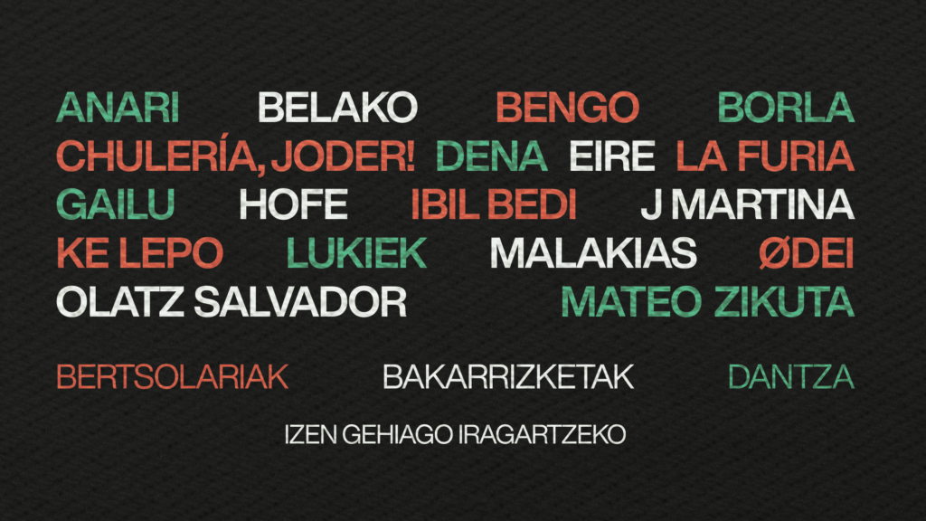 También está prevista la participación de Borla, Chulería Joder!, Dena, La Furia, Gailu, Ke Lepo, Odei y Mateo Zikuta, así como la presencia de dantzaris, bertsolaris y humoristas, ampliando el formato más allá de los conciertos.