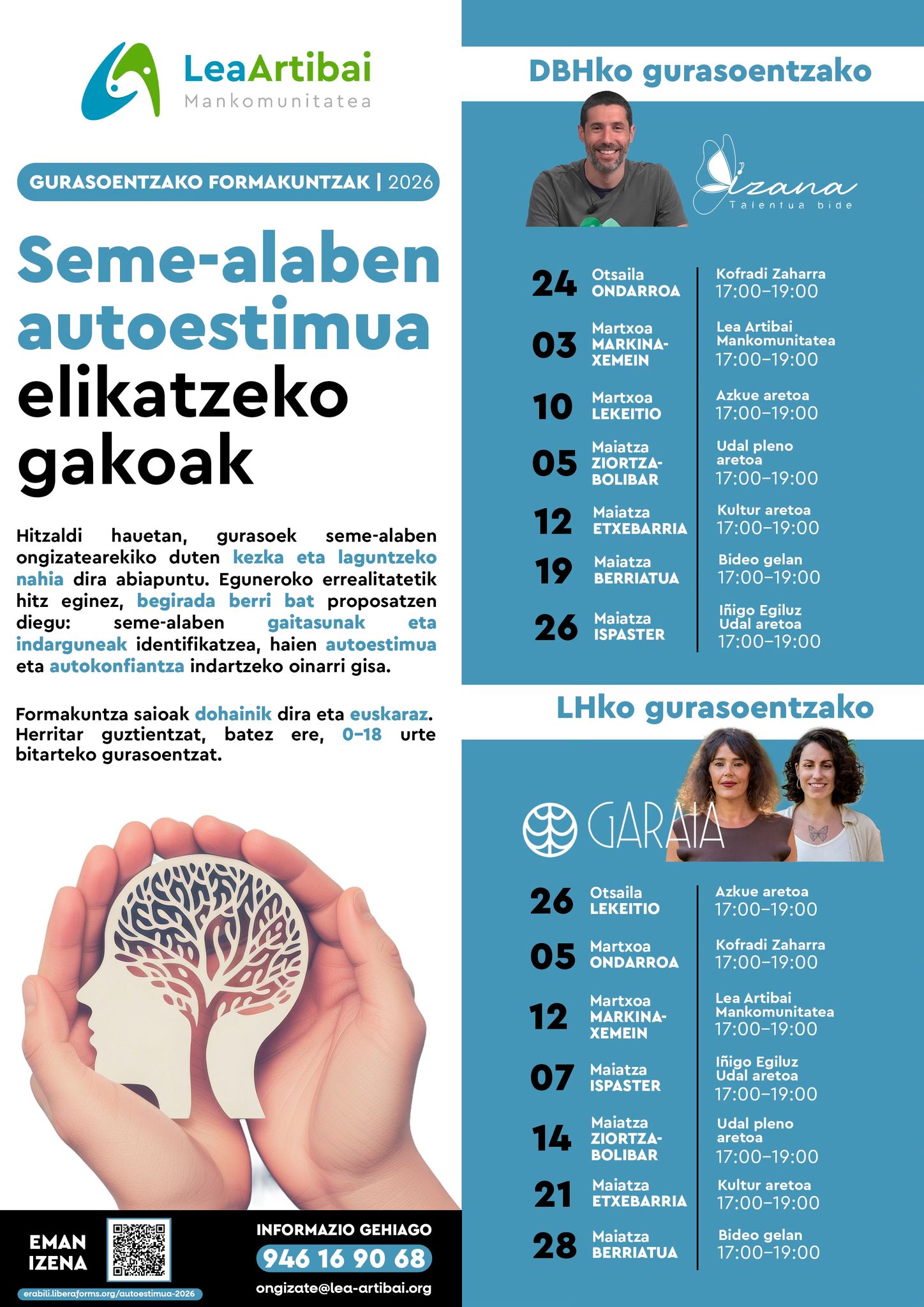 Lea Artibai Mankomunitateak gurasoei zuzendutako formakuntza saioak antolatu ditu, seme-alaben ongizatea eta garapen emozionala indartzeko helburuarekin. Hitzaldi hauetan, gurasoen kezka eta laguntzeko nahia hartuko dira abiapuntu gisa, eta eguneroko errealitatetik abiatutako ikuspegi praktikoa eskainiko da.