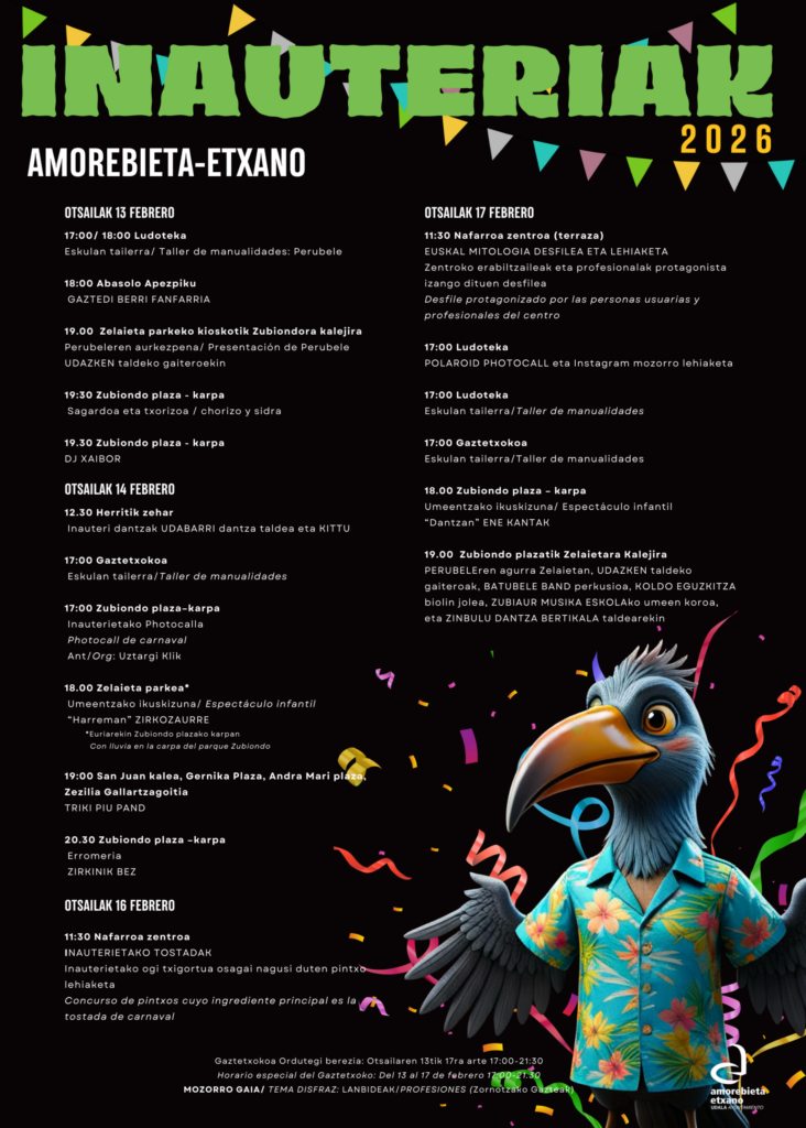 Un año más, las calles de Amorebieta-Etxano se vestirán de color del 13 al 17 de febrero con motivo de la celebración de los carnavales. El viernes 13 de febrero dará comienzo el carnaval. A partir de las 17:00 horas, se celebrará un taller de manualidades en la ludoteca, y a las 18:00 horas, la banda Gaztedi Berri Fanfarria animará la fiesta en la calle Abasolo Apezpiku. A las 19:00 horas, desde el quiosco del Parque Zelaieta, partirá un pasacalles hacia Zubiondo.