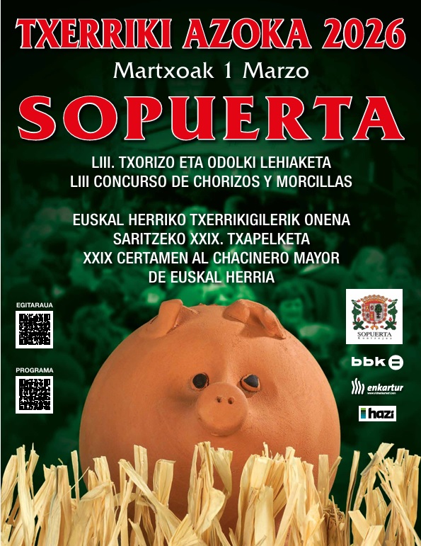 ¡Vuelve la Txerriki Azoka! El domingo 1 de marzo, Sopuerta celebrará la chacina en la plaza de Santa Ana. Una cita con más de medio siglo de tradición para compartir los mejores sabores de nuestra tierra. Disfruta del ambiente festivo entre txosnas y con el tradicional Concurso de Chorizos y Morcillas. Podrás recorrer decenas de puestos, adquirir productos locales (desde miel y quesos hasta el mejor talo) y participar en nuestras catas comentadas.