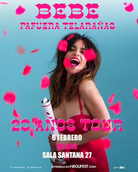 BEBE anuncia por sorpresa una gira por España para celebrar los veinte años del exitoso “Pafuera telarañas”. Una gira internacional, con unas pocas fechas seleccionadas, que incluirán la visita de la artista a México, Argentina, Chile, Uruguay y Estados Unidos, Puerto Rico… Pafuera telarañas cumple 20 años y Bebe sale con toda la banda a rememorar el repertorio del disco en una irrepetible gira.