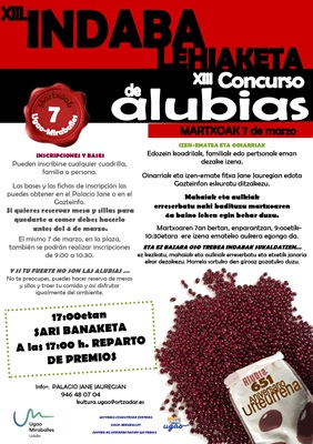 El concurso de alubias, una de las citas más apreciadas en el calendario ugaotarra, vuelve para conmemorar la fundación de la noble villa. En esta ocasión, y coincidiendo con el 651 aniversario, el Ayuntamiento, en colaboración con el centro de interpretación, ha organizado la XIII edición del certamen, cuya jornada principal se celebrará el sábado 7 de marzo en Herriaren Enparantza. La jornada comenzará sobre las 9:00h. Como viene siendo habitual, podrán participar particulares, familias y cuadrillas. Las inscripciones podrán realizarse de las siguientes formas: