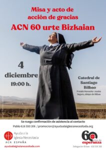 La Fundación Pontificia Ayuda a la Iglesia Necesitada-ACN lanza una campaña con los benefactores como protagonistas y apela a todas las personas a unirse a esta causa. Misa de acción de gracias en la Catedral de Bilbao el jueves 4 de diciembre a las 19 horas, presidida por Monseñor Joseba Segura. A continuación, acto celebrativo con piscolabis en Plaza Nueva 4. Ayuda a la Iglesia Necesitada celebra su 60 aniversario con una misa y un acto de acción de gracias.