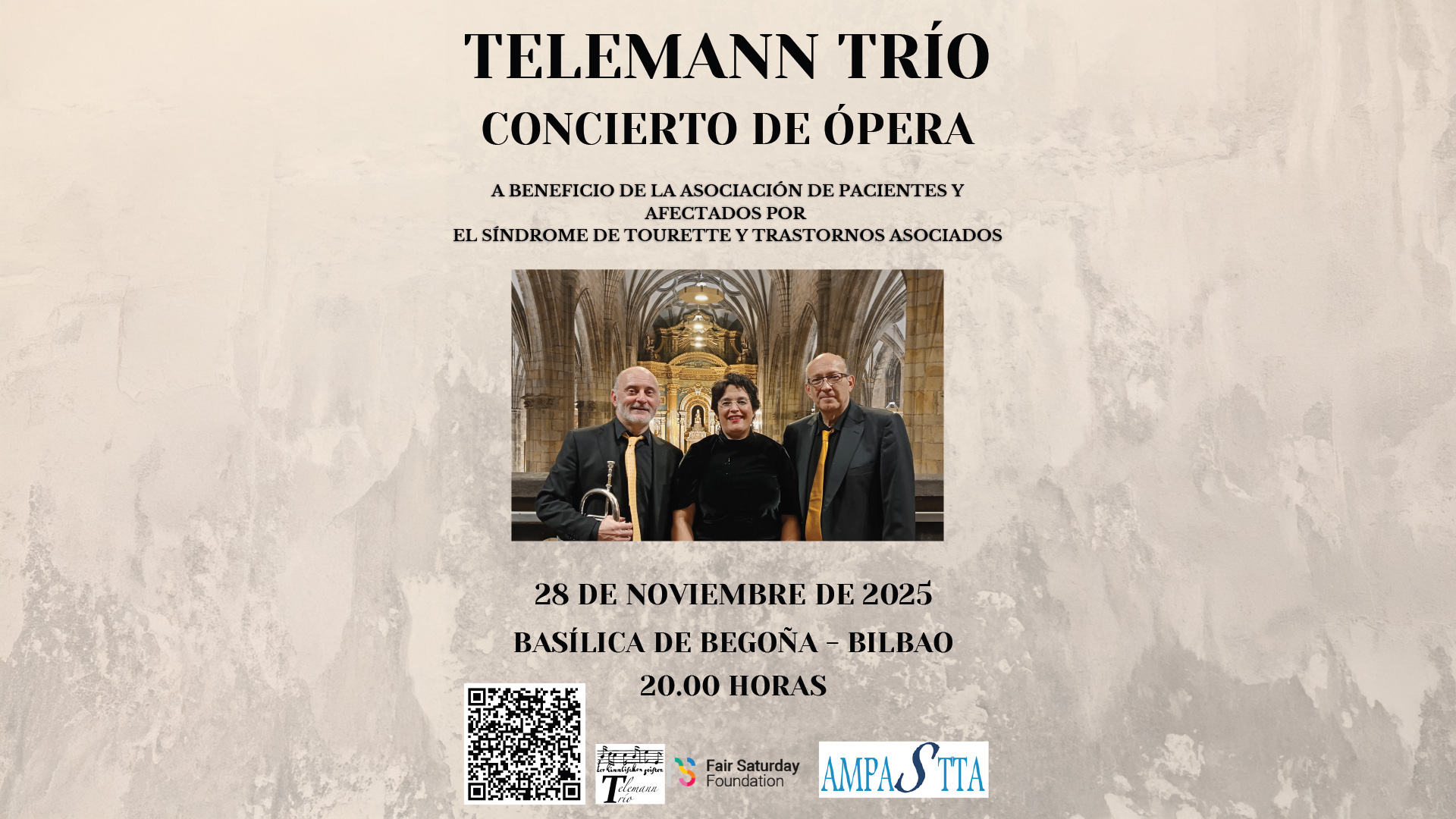 Concierto de ópera a beneficio de AMPASTTA en el Festival Fair Saturday 2025. La Basílica de Begoña acogerá un concierto solidario de Telemann Trío con obras de Verdi, Wagner, Puccini, Donizetti, Bizet y Offenbach el viernes 28 de noviembre a las 20:00 h.