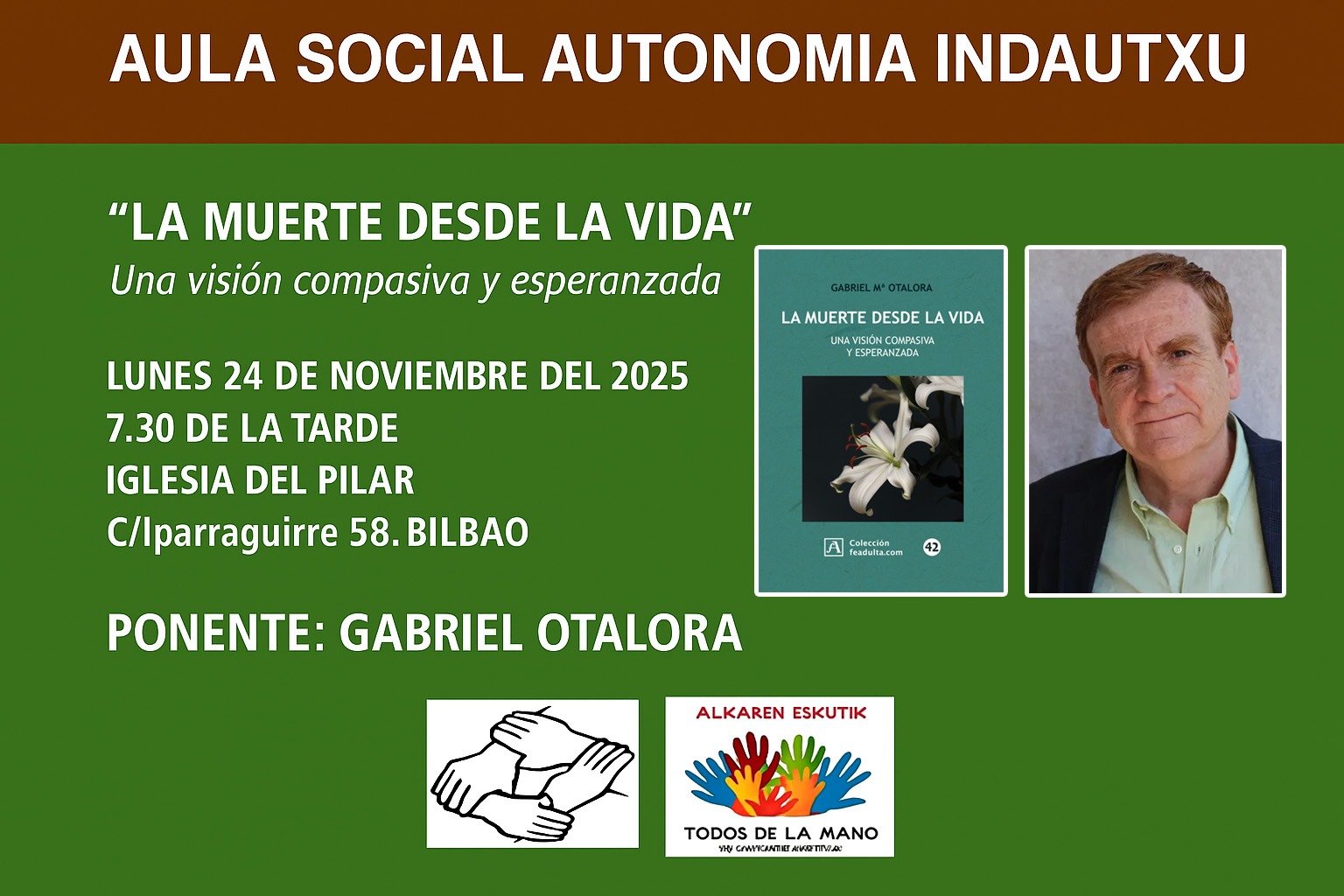 Conferencia de Gabriel Otalora «La muerte desde la vida» del Aula Social Autonomía-Indautxu. Será en la iglesia de El Pilar de Bilbao, calle Iparraguirre 58, el lunes 24 de noviembre a las 19:30. Gabriel Mª Otalora presentaba «La muerte desde la vida. Una visión compasiva y esperanzada» de la Colección feadulta.com el miércoles 28 de mayo de 2025 en la iglesia Ntra. Sra. de las Mercedes, Las Arenas.