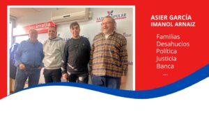 Y lo peor de todo es que también arrastró a sus padres y a sus suegros, además de a su mujer y a su hijo adolescente. Hemos asistido a su testimonio junto a Imanol Arnaiz, portavoz de la plataforma Kaleratzetik Ez. La banca, los fondos buitre que compran las hipotecas y la lentitud de la justicia se han aliado y ahora, tras el desahucio, está viviendo en un piso cedido por el Ayuntamiento de Erandio.