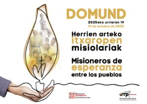 Manuel comenta que «el jueves, 9 de octubre tendrá lugar en Barria (Plaza Nueva, 4) una Mesa de testimonios misioneros con ocasión de la celebración de la XCIX jornada del Domingo Mundial de las Misiones (DOMUND). La mesa está organizada por la Pastoral de Migraciones y la Delegación de Misiones. Participarán Isabel Matilla y Jaione López, misioneras laicas; Maider Hermoso y Aimar Tomás, que son dos jóvenes que han realizado el curso Norte-Sur y que este verano han participado en una experiencia misionera en Togo y Bolivia, respectivamente y Carla Hernández, mujer nicaragüense asentada en Amorebieta».