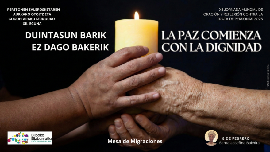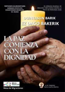 Marije Calvo, Responsable de Migraciones, explica que «el lema de 2026 “La paz comienza con la dignidad – Duintasunik barik ez dago bakerik” es una invitación del papa León XIV a reconocer la trata de personas como una grave vulneración de la dignidad humana y una profunda injusticia social».