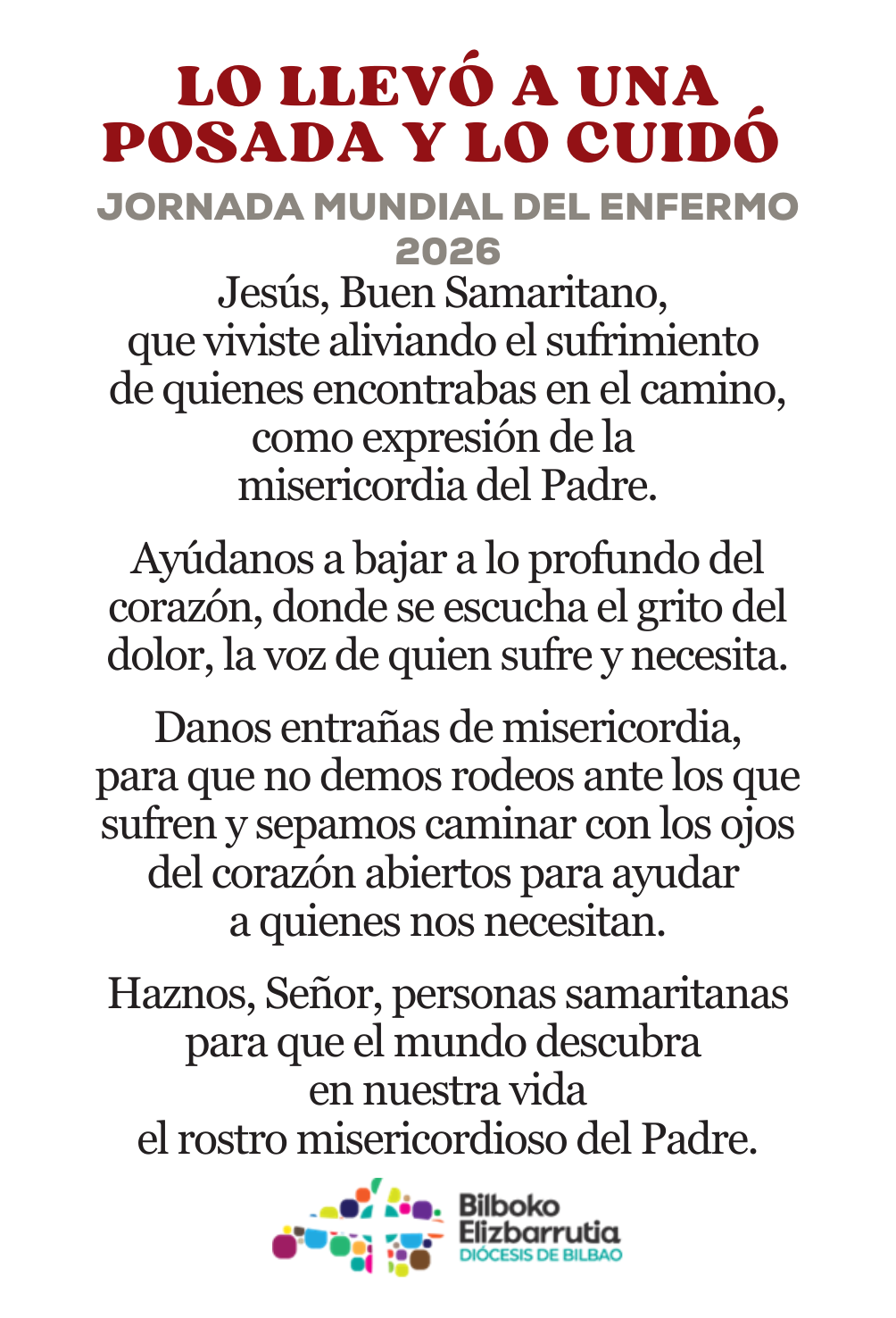 «Al igual que el buen samaritano que se detiene y se inclina ante el herido en el camino, la comunidad cristiana está llamada a detenerse ante quien sufre, y a dar testimonio evangélico de compasión y servicio hacia los enfermos y los más vulnerables pues “el dolor que nos conmueve, no es un dolor ajeno, es el dolor de un miembro de nuestro propio cuerpo al que nuestra Cabeza nos manda acudir para el bien de todos”.