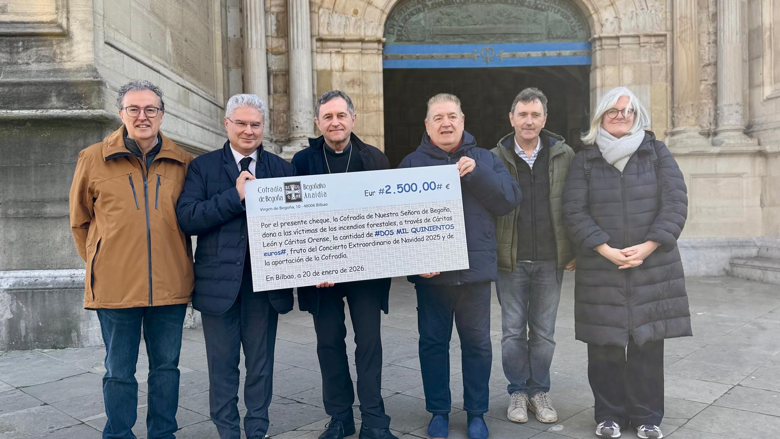 Hoy martes 20 de enero, a las 12.00, con la presencia del Obispo de Bilbao, D. Joseba Segura, ha tenido lugar en el exterior del Santuario de Begoña, la entrega simbólica de un cheque de dos mil quinientos euros (2.500 €) que la Cofradía de Begoña ha donado a Caritas Astorga-León y Ourense para ayudar a las víctimas de los devastadores incendios que azotaron el pasado verano a las provincias de León y Orense. La Cofradía de Begoña entrega a Cáritas la recaudación del concierto de Navidad.