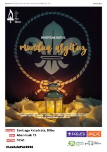 Este viernes, 19 de diciembre, se entregará en la Catedral de Santiago un símbolo de paz, la Luz de la Paz de Belén, a las 19:00 horas. Toda la Diócesis está invitada a celebrar la llegada de la Buena Noticia junto con otros grupos de pastoral juvenil de la Diócesis de Bilbao. Celebración de La Luz de la Paz de Belén de Euskalerriko Eskautak Bizkaia el viernes 19 de diciembre.