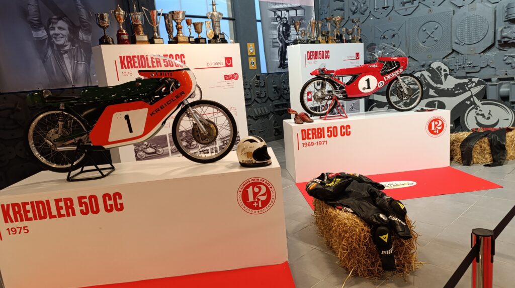 En la exposición se pueden ver nueve motos: las monturas con las que Nieto ha ganado sus campeonatos del mundo, desde las Derbi de 50 cc (refrigeradas por aire y por agua) hasta modelos posteriores como la Bultaco o la Garelli, entre otras. Olaizola ha subrayado el valor deportivo de una trayectoria que sigue marcando época: “12 más 1 mundiales… es algo que no está al alcance de casi nadie”.