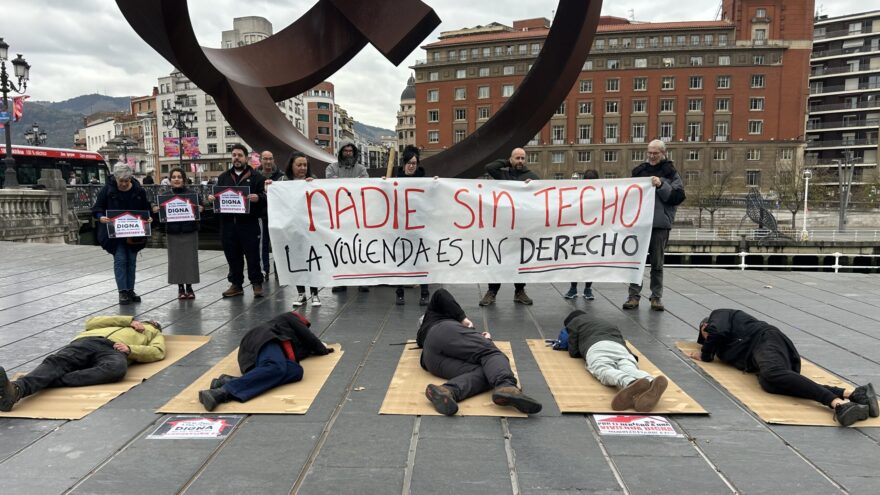 Tumbadas en el suelo frente al Ayuntamiento de Bilbao, entre cartones, varias plataformas sociales han denunciado la grave situación de emergencia habitacional que vive la ciudad. La protesta ha servido para visibilizar la realidad de cientos de personas sin hogar, así como para exigir un cambio profundo en la política de vivienda de las administraciones públicas.