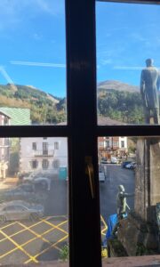 Estamos en una de las estancias del Ayuntamiento de Galdames, desde su ventana vemos los montes al fondo y la plaza de San Pedro con las obras que darán forma a un nuevo espacio de encuentro, la nueva casa de cultura.