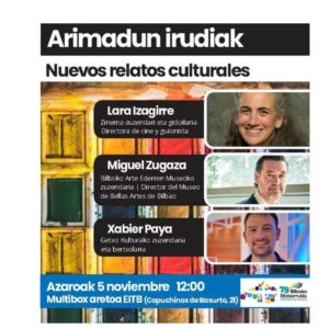 La Mesa de Entidades Culturales de la diócesis de Bilbao organiza el 5 de noviembre el encuentro “Imágenes con alma: nuevos relatos culturales”, un foro de diálogo que reunirá a la cineasta Lara Izagirre, el director del Museo de Bellas Artes de Bilbao, Miguel Zugaza, y al gestor cultural y bertsolari Xabier Paya. Presentación pública de la Memoria Cultural de la diócesis de Bilbao.