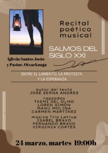 La iglesia Santos Justo y Pastor de Otxarkoaga acogerá este martes, 24 de marzo, a las 19:00 h., un emotivo recital poético-musical titulado «Salmos del Siglo XXI», una propuesta que combina palabra y música bajo el lema «Entre el lamento, la protesta y la esperanza». Recital poético-musical en Otxarkoaga: «Salmos del siglo XXI».